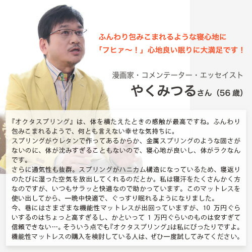 ◇セット内容 ・オクタスプリングトッパーシングル 定価19,800円(税抜) 【サイズ】7 × 97 × 193 (cm) 【材質】ウレタンフォーム 【外装生地組成】ポリエステル100% ・オクタサポート マルチクッション 定価6,800円(税抜) 【サイズ】ピロー本体:17 × 17 × 44 (cm) 【材質】中袋: ポリエステル100% 詰めもの: ウレタンフォーム ピローカバー: ポリエステル100% ◇キーワード:マットレス,トッパー,寝具,布団,快眠,いびき,不眠,寝言,腰痛,肩こり,寝つき,ダニ,菌,ハニカム,低反発,高反発,ハイブリッド,5つ星,ぐっすり,睡眠不足,熟睡,敷布団,シングル ※お一人様5セットまでのご購入とさせて頂きます。