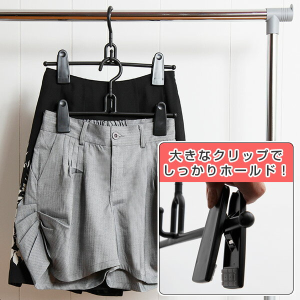 大きなクリップがスカートをがっちりキャッチ!ボトムスを普通のハンガーに掛けるとズレ落ちる事が気になりませんか?直すのは手間だし、面倒ですよね。