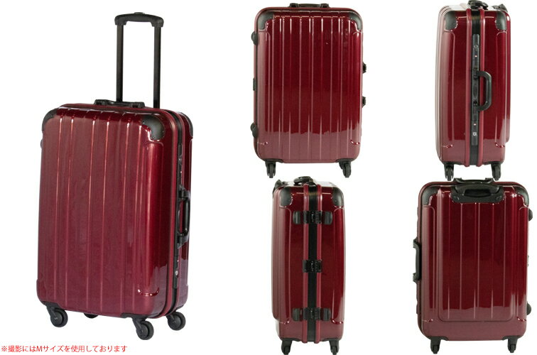 ・全サイズ共通:ボルドー ネイビーブルー ブラック シルバーの4色展開 スペック 大きさ 重さ・容量 車輪 旅行日目安 S:(内寸)44×29.5×24.5cm(外寸)52×34.5×25.5cm M:(内寸)62.5×44.5×25.5cm(外寸)72×49×28.5cm L:(内寸)68.5×48.5×25.5cm(外寸)68.5×48.5×25.5cm S:4.0kg 約31リットル M:5.8kg 約71リットル L:6.4kg 約85リットル 4輪 S:1〜3日前後 M:5〜1週間前後 L:10日間前後〜長期 ダイアルロック キーロック TSAロック キャリーハンドル × ○ ○ ○・2段階調節 中の仕切り ハンガー イニシャルシール 送料 ○ 1本 1枚 全国送料無料 *外寸は、キャスターや上部取っ手など、すべての凹凸を含んだ数字です。