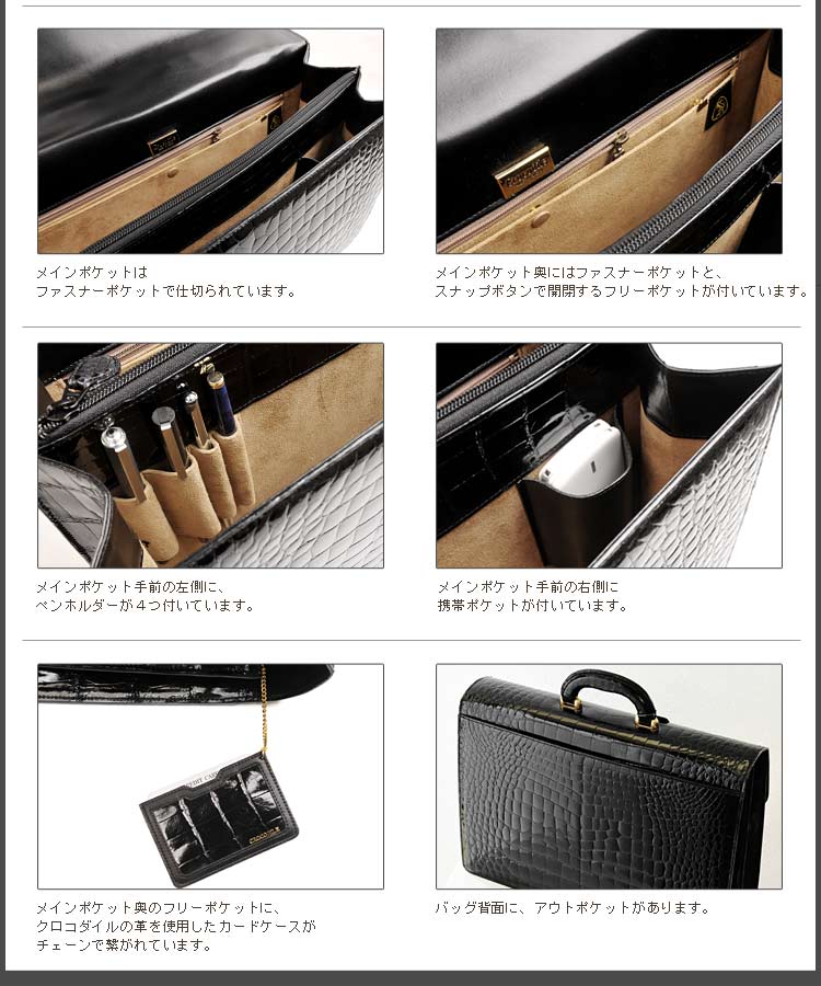 商品詳細 素材表地:ナイルクロコダイル (シャイニング)内装:エクセーヌ 原産国日本(縫製) 内側収納・ファスナーポケット×2・スナップボタン式フリーポケット×1・携帯電話ポケット×1・ペンホルダー×4・カードケース×1 外側収納・アウトポケット×1 開閉ダイヤルロック 底鋲なし ギフト:ラッピング対応 品番:9155sr お問い合わせの際は、コチラの品番をお伝えください 商品名:メンズ バッグ ナイル クロコダイル シャイニング センター取り ※当店で使用している本革は全て本物の革を使用しています。